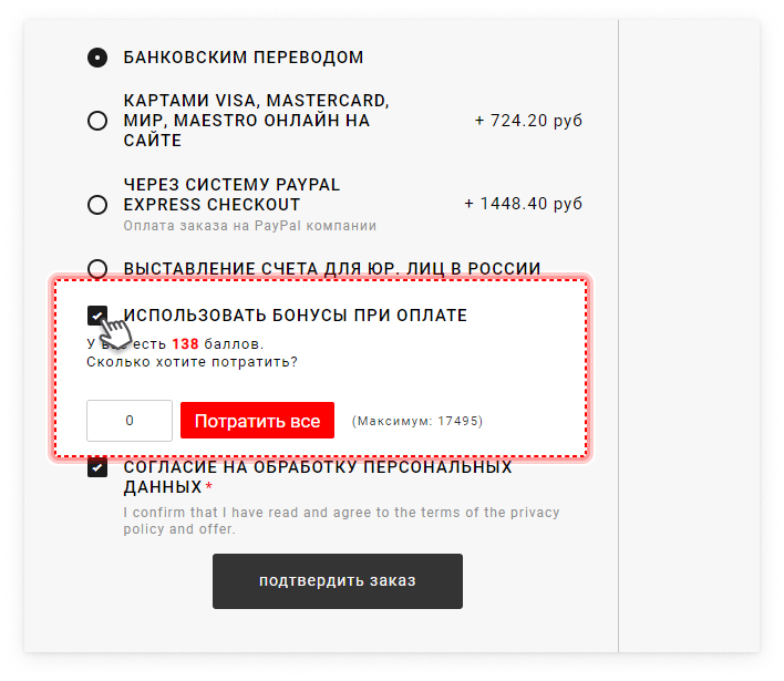 Чтобы использовать баллы, нужно оформить заказ и в способе оплаты поставить галочку